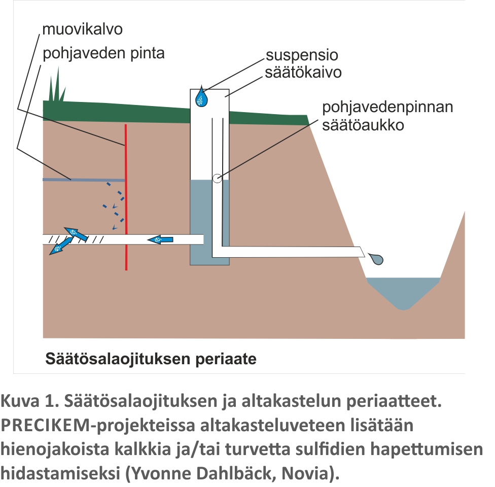 PRECIKEM-projekteissa on keskitytty happamilla sulfaattimailla sijaitsevien viljelymaiden käsittelyyn. Tavoitteena on ollut nostaa valumavesien pH-arvoa, saostaa liuenneita metalleja sekä hidastaa sulfidien hapettumista ja siihen liittyvää haponmuodostumista muokkauskerroksen alapuolella olevassa osittain hapettuneessa sulfaattimaakerroksessa. Koska muokkauskerroksen kalkitseminen ei vaikuta sen alapuolella oleviin maakerroksiin, on PRECIKEM-projekteissa pyritty hyödyntämään salaojaputkistoja ja maan kuivuessa muodostuvaa halkeamien ja säröjen verkostoa. Salaojaputkiston kautta on pumpattu hapettumista estäviä kemikaaleja (hienojakoista kalkkikiveä, kalsiumhydroksidia, saostettua kalsiumkarbonaattia tai turvetta) sisältäviä suspensioita osittain hapettuneen sulfaattimaakerroksen hydrologisesti aktiivisiin makrohuokosiin. Tämä PRECIKEM-käsittely on kehitetty säätösalaojituksesta ja siihen liittyvästä altakastelusta (kuva 1) sekoittamalla altakasteluveteen em. hapettumista estäviä aineita.