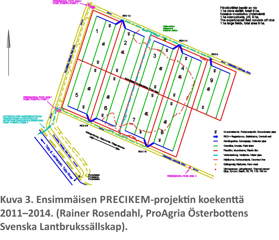 PRECIKEM-projekteissa on rakennettu Vaasan Risöfladanille Yrkesakademin i Österbotten -oppilaitoksen viljellyille pelloilla koekenttä, jotta menetelmää voidaan testata käytännön mittakaavassa. Koekenttä on jaettu useisiin koeruutuihin, jolloin voidaan samanaikaisesti verrata eri käsittelyjen vaikutusta salaojista purkautuvien vesien laatuun. Osa koeruuduista jätetään ilman kemikaalikäsittelyjä, jolloin ne toimivat vertailuruutuina.