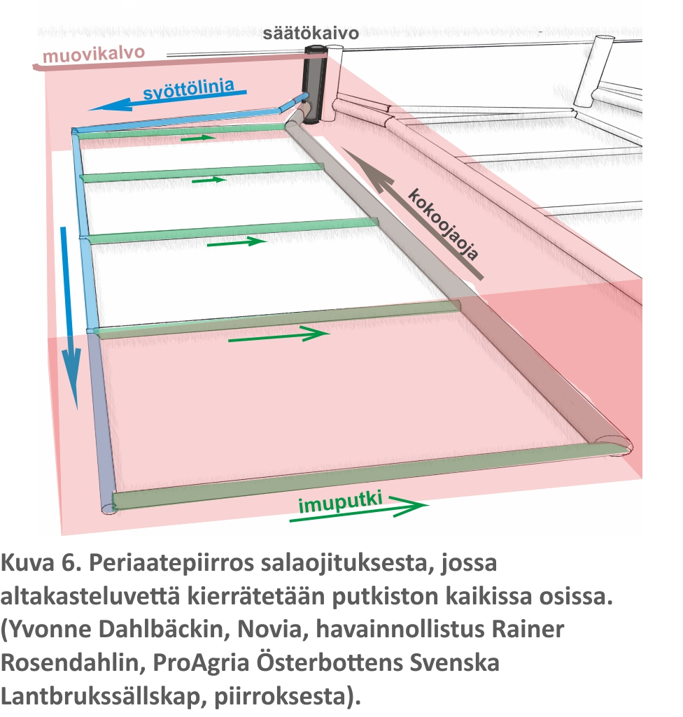 Vuosina 2012–2014 tehdyissä kenttäkokeissa oli nimittäin todettu käsittelysuspensioiden tunkeutuvan parhaiten maaperään lähellä säätökaivoja, jossa paine ja virtausnopeus ovat suurimmat kun taas imuojien päissä virtausnopeus on nolla ja käsittelysuspensioiden tunkeutuminen maaperään vähäistä. Niinpä projektissa kehitettiin kuvassa 6 havainnollistettu salaojitusmenetelmä missä altakasteluvettä kierrätetään putkiston kaikissa osissa ja vältetään umpiperät, joihin käsittelysuspensio voisi saostua.