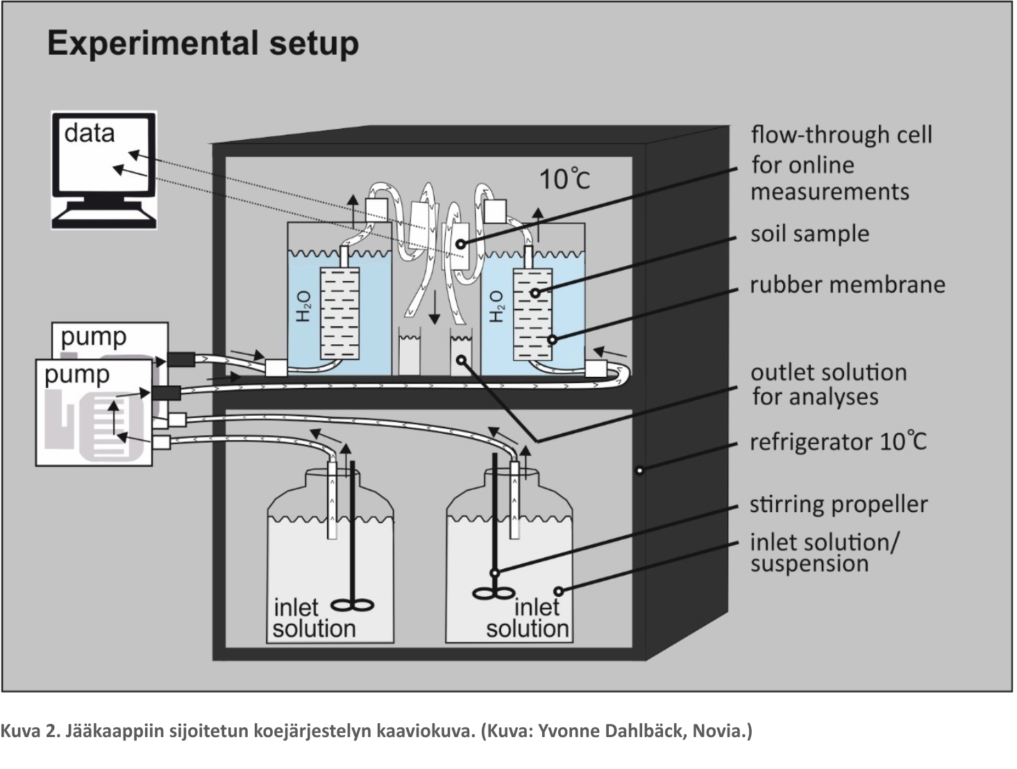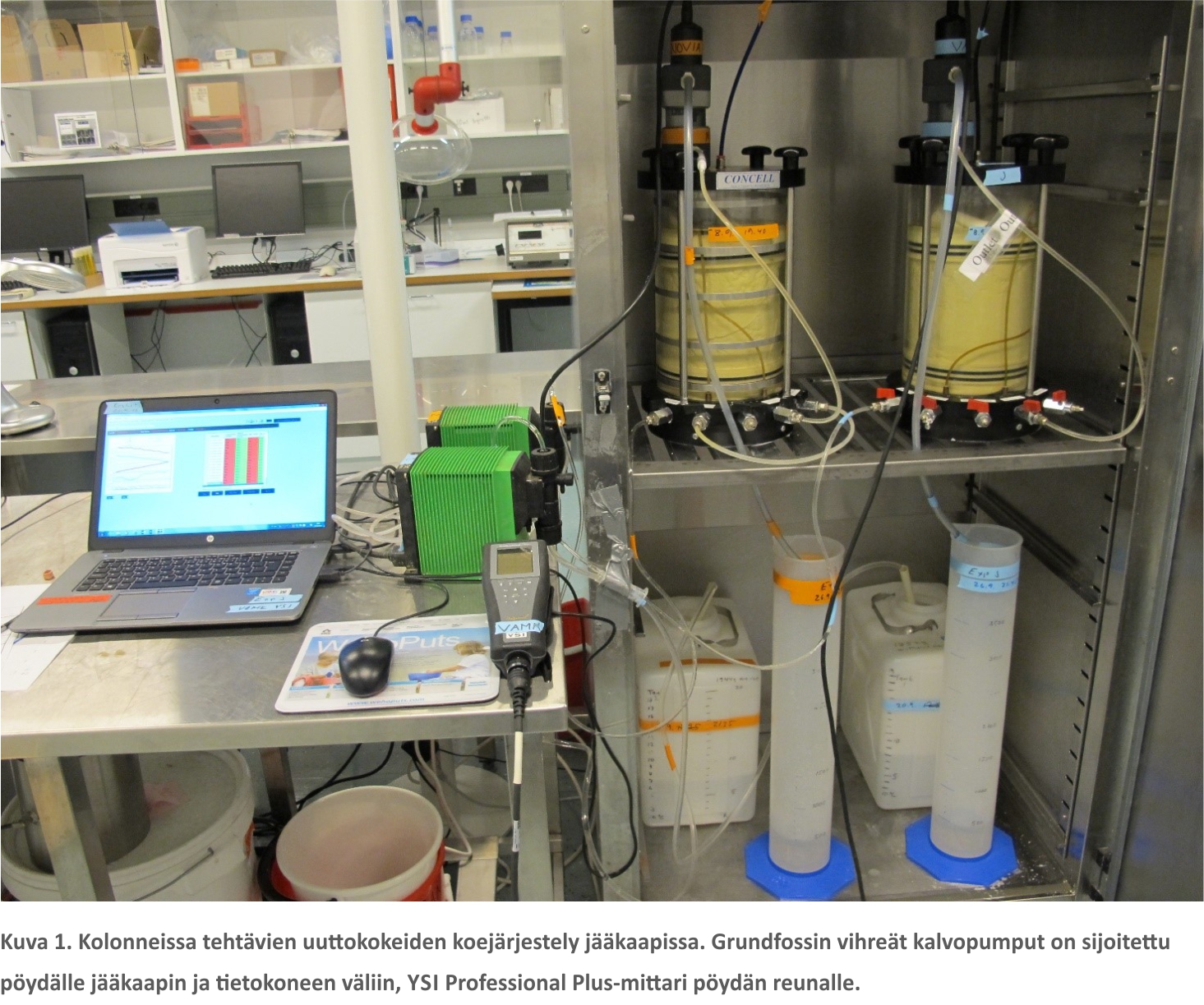 Häiriintymättömillä maanäytteillä kolonneissa tehtyjä uuttokokeita jatkettiin PRECIKEM ll -projektissa vuosina 2015–2018. Näytteet otettiin samoin kuin PRECIKEM-projektissa vuosina 2011–2014 ja koelaitteistokin oli sama Geo-Petech-yrityksen valmistamaa Concell-vedenläpäisylaitteisto. Koejärjestelyä kuitenkin kehitettiin ja kokeilla haettiin vastauksia myös uusiin kysymyksiin. Projektissa tehtiin aina kaksi koetta rinnakkain ja laitteisto siirrettiin kuvista 1 ja 2 ilmenevällä tavalla jääkaappiin lämpötilaan 10 °C, joka vastaa maaperässä syvyydellä 70–85 cm vallitsevaa keskimääräistä lämpötilaa. Hydrostaattisen paineen sijasta huuhteluvesi ja käsittelysuspensiot pumpattiin maanäytteiden läpi kalvopumpuilla (Grundfoss DME tai DDA), mikä mahdollisti vakiovirtauksen ylläpitämisen ja virtauksen säätämisen koko koejakson ajan. Ominaisjohtokyvyn, pH-arvon ja redox-potentiaalin mittaamiseen käytetyt YSI Professional Plus -mittarit kytkettiin suoraan tietokoneeseen. Erityistä huomiota kiinnitettiin käsittelyjen vaikutukseen mikrobipopulaatioihin ja niinpä huuhteluissa sekä suspensioiden valmistuksessa ryhdyttiin käyttämään autoklavoitua vettä (höyrysteriloitu lämpötilassa 120 °C) mikrobiologisen kontaminaation minimoimiseksi.
